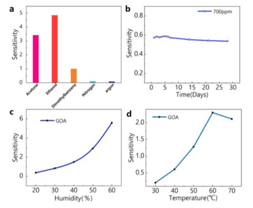Figure 5 (a) GOA在高乙醇濃度環(huán)境中對不同氣體的選擇性,(b) GOA樣品在乙醇上的長期穩(wěn)定性,(c)乙醇濃度為600ppm時,GOA靈敏度與濕度的關系和(d)乙醇濃度為500ppm時,GOA靈敏度與溫度的關系。