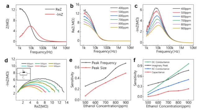 Figure 6 (a)無乙醇環(huán)境下阻抗實部和虛部與頻率的關系,(b)不同乙醇濃度下阻抗實部與頻率的關系,(c)不同乙醇濃度下阻抗虛部與頻率的關系,(d)阻抗譜,(e)乙醇濃度與峰頻率和峰大小的關系,(f)直流電導、交流電導、電容和虛部峰的靈敏度比較。