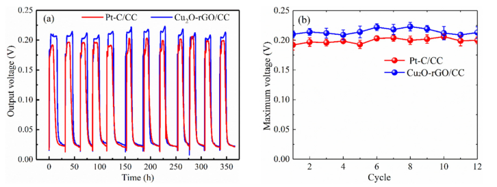 2O-rGO/CC和Pt-C/CC的MFCs的輸出電壓周期(a)和每個周期的最大電壓(b)。