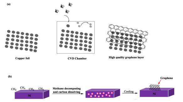 Figure 2. 通過CVD程序?qū)Γ╝)銅和(b)鎳上的金屬原子和石墨烯形成的模板作用說明。