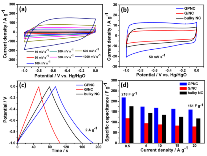 Figure 2. (a)GPNC在不同掃描速率下的CV曲線;(b)GPNC、G/NC和塊狀NC的CV曲線;(c)GPNC、G/NC和大體積NC在2 A/g時的GCD曲線;(d)不同電流密度下GPNC、G/NC和大塊NC的比電容。