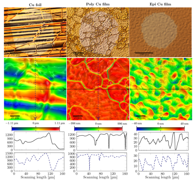 Figure 1. 石墨烯生長(zhǎng)后銅箔(左欄),多晶銅膜(中欄)和外延銅膜(右欄)的銅表面形態(tài)比較。上圖:經(jīng)過輕微氧化的光學(xué)顯微鏡圖像。中間:3D光學(xué)輪廓儀圖像。底部:沿中間3D輪廓中顯示箭頭的2D截面。