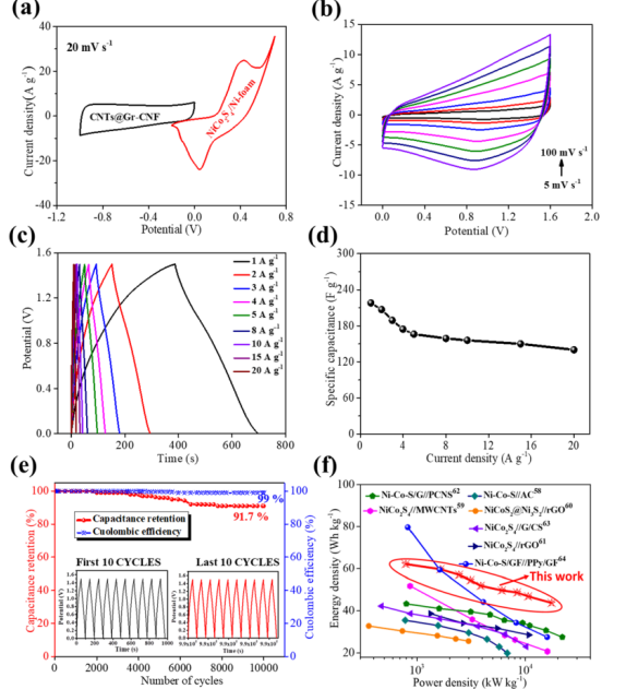 4納米針作為正極的混合超級(jí)電容器。該混合動(dòng)力設(shè)備在1 A/g處顯示出218 F/g的比電容,在789.66 W/kg的功率密度下顯示出62.13 Wh/Kg的能量密度。此外,該器件具有出色的循環(huán)穩(wěn)定性,在10,000次充放電循環(huán)后,其比電容的保留率為91.7%。所得結(jié)果表明,CNTs@Gr-CNF材料具有用于高級(jí)混合超級(jí)電容器負(fù)極的高度理想性能。