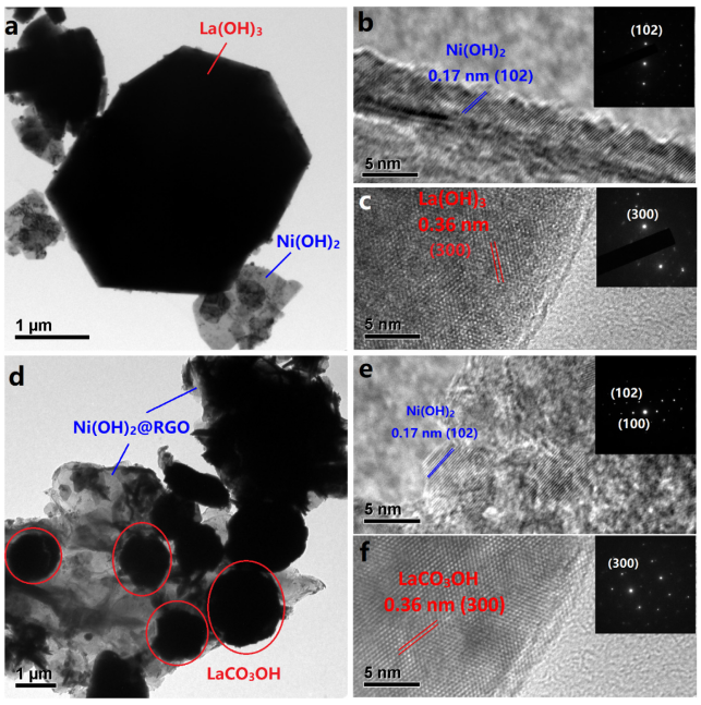 Figure 3. LNO-230(a-c)和LNO-GO-230(d-f)的TEM和HRTEM圖像以及相應的SAED模式(請參見插圖)