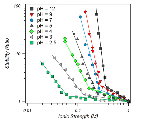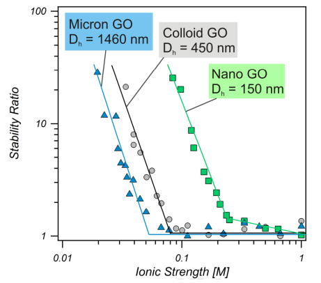 Figure 3. 在不同pH值下,納米GO顆粒與離子強(qiáng)度的穩(wěn)定性比。