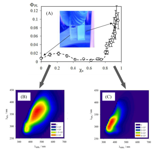 Figure1.(A):水懸浮液中碳點(diǎn)的光致發(fā)光量子產(chǎn)率(FPL)與反應(yīng)混合物中尿素含量的函數(shù)關(guān)系(cu)。(B)和(C)CD和CND懸浮液分別在水中的激發(fā)-發(fā)射矩陣。