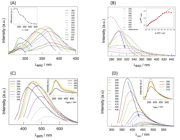 Figure 5. (A)在350 nm處衰減率為0.05時(shí)CD水性懸浮液的激發(fā)光譜。插圖:相應(yīng)的紫外可見(jiàn)光衰減譜。(B)CND水性懸浮液的激發(fā)光譜。虛線代表相應(yīng)的衰減譜。插圖:最大發(fā)射能量與激發(fā)能量的關(guān)系曲線。(C)和(D)分別代表CD和CND在280至440 nm激發(fā)波長(zhǎng)范圍內(nèi)的相應(yīng)發(fā)射光譜。