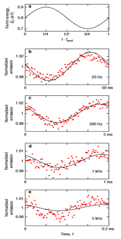 將單光子發(fā)射器的量子光學(xué)特性與納米光子和等離子體系統(tǒng)中強(qiáng)大的近場相互作用相結(jié)合,是創(chuàng)建量子操作和計(jì)量功能的有效方法。在這方面,主動和動態(tài)調(diào)節(jié)發(fā)射器-環(huán)境相互作用的能力特別重要。雖然熱調(diào)制、機(jī)械調(diào)制和光調(diào)制已相繼被證明,但電氣調(diào)制仍然是一個突出的挑戰(zhàn)。在此,我們通過原位調(diào)整石墨烯的費(fèi)米能量,實(shí)現(xiàn)了快速、全電調(diào)制鉺發(fā)射體納米層與石墨烯之間的近場相互作用。我們展示了強(qiáng)大的相互作用,對于約25%的發(fā)射器,衰減率提高了1000倍以上,并以高達(dá)300 kHz的頻率對這些相互作用進(jìn)行了電調(diào)制,比發(fā)射器的輻射衰減(約100 Hz)快幾個數(shù)量級。這為集成量子技術(shù)提供了一個有利的平臺,為通過控制波形的集體等離子體發(fā)射或光子發(fā)射來產(chǎn)生量子糾纏開辟了途徑。