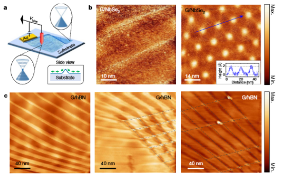 二維原子晶體可以從根本上改變其性能,以響應(yīng)外部影響(例如襯底方向或應(yīng)變),從而形成具有新穎電子結(jié)構(gòu)的材料。例如,雙層石墨烯中由于兩層方向之間的“魔角“而產(chǎn)生的弱色散的“扁平”帶。這些平坦帶中的猝滅動能促進(jìn)了電子與電子的相互作用,并促進(jìn)了強(qiáng)相關(guān)相的出現(xiàn),例如超導(dǎo)性和相關(guān)絕緣體。然而,雙扭曲層石墨烯中獲得魔角所需非常精確的微調(diào),對制造和可擴(kuò)展性提出了挑戰(zhàn)。在這里,我們提出了一種不涉及微調(diào)的扁平帶制備方法。使用掃描隧道顯微鏡和光譜學(xué)以及數(shù)值模擬,我們證明了放置在原子平坦基板上的石墨烯單分子層可能會被迫經(jīng)歷屈曲轉(zhuǎn)變,從而產(chǎn)生周期性調(diào)制的偽磁場,進(jìn)而產(chǎn)生“后磁化”,另一方面產(chǎn)生了平坦電子帶的石墨烯材料。當(dāng)我們使用靜電摻雜將費(fèi)米能級引入到這些平帶中時(shí),我們觀察到態(tài)密度中偽間隙狀耗盡,這標(biāo)志著相關(guān)態(tài)的出現(xiàn)。二維晶體的這種屈曲為創(chuàng)建其他超晶格系統(tǒng)提供了一種策略,尤其是探索了平坦帶特有的相互作用現(xiàn)象。