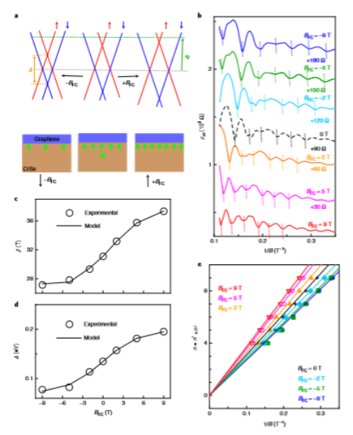 開發(fā)低耗散、長距離自旋輸運的石墨烯基多功能自旋電子器件,需要石墨烯中的自旋分裂。磁性鄰近效應是在材料中實現(xiàn)交換分裂的一種有效途徑,否則該分裂本質上是非自旋極化的。在這里,我們表明,單層石墨烯可通過與硒化鉻的反鐵磁薄膜耦合而磁化,從而在2 K時產(chǎn)生高達134 meV的交換分裂能。這種交換分裂通過量子霍爾平臺的位移和石墨烯中的量子振蕩表現(xiàn)出來,其能量可以通過場冷卻進行調(diào)制,隨著正場冷卻交換分裂能量增加,隨著負場冷卻交換分裂能量減少。我們對低溫下石墨烯磁性的實驗演示,得到了電阻率隨溫度變化的測量結果和磁光克爾測量結果。