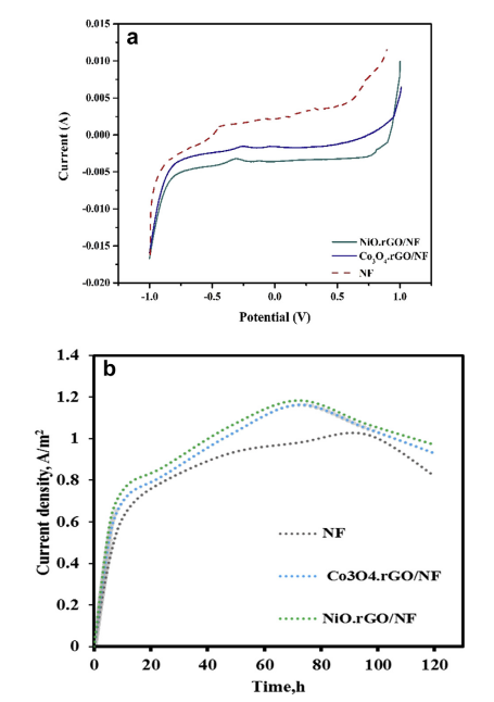 Figure 3. (a)兩個涂層陰極與NF的線性掃描伏安圖。(b)在磷酸鹽緩沖溶液中,施加電壓1.0 V時,MECs中不同陰極的電流密度。
