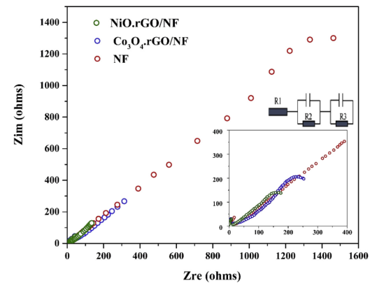 Figure 4. 兩個涂層陰極以及NF的奈奎斯特圖。