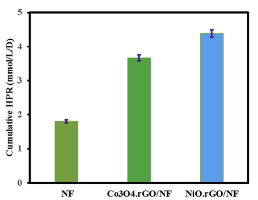 4.rGO陰極相比,該涂層在600 mV電壓下的過電勢較小,并且在Nyquist圖中具有最低的電阻。實驗結(jié)果表明,在1.0 V的施加電壓下,NiO.rGO納米復(fù)合材料的最大產(chǎn)氫率為4.38±0.11 mmol/L/D,庫倫效率為65.6%,陰極氫回收率為20.8%。就生產(chǎn)生物氫而言,MEC性能比Co