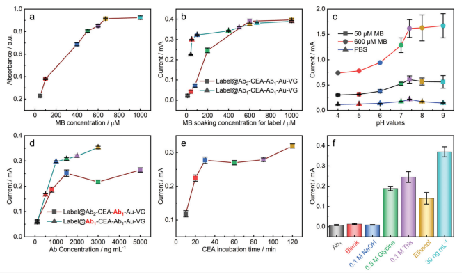 2-亞甲基藍(lán)(MB)的癌胚抗原(CEA)。金納米顆粒(NPs)-垂直石墨烯(VG)電極通過(guò)固定大量包被抗體(Ab)來(lái)有效放大響應(yīng)信號(hào),并具有出色的電催化活性。具有核-殼納米結(jié)構(gòu)和檢測(cè)抗體的MB納米點(diǎn)負(fù)載的Au@SiO