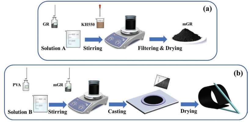 Figure 1. a)改性石墨烯和b)柔性GR/PVA膜狀復(fù)合材料的合成示意圖。