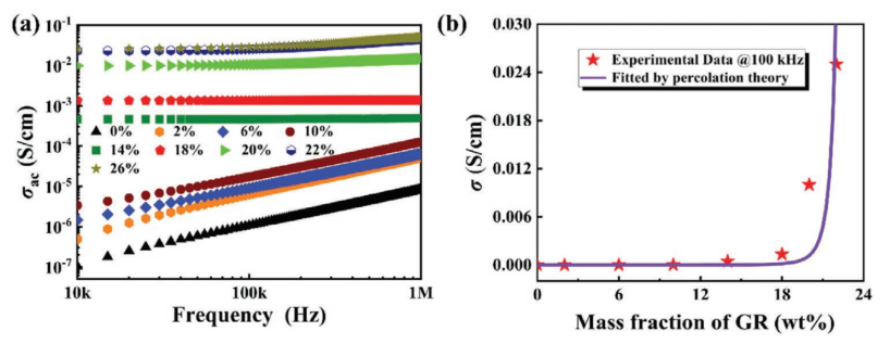 Figure 3. 石墨烯質(zhì)量比不同的GR/PVA膜狀復(fù)合材料的電性能。a)交流電導(dǎo)率譜圖和b)導(dǎo)電率對石墨烯含量的依賴性。
