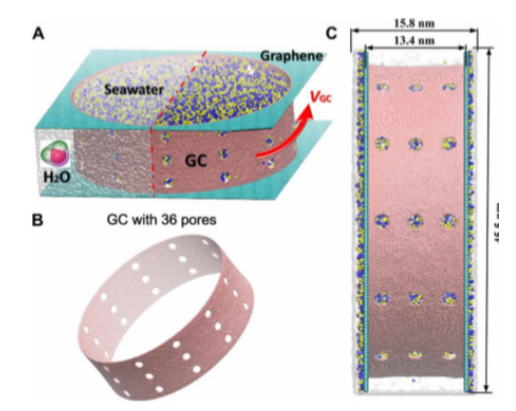 Fig. 3. 剪切孔隙石墨烯模型中滑移速度引起的超高抗鹽性。