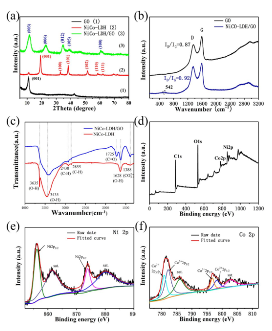 Figure1. (a) GO, CoNi-LDH和CoNi-LDH/GO的XRD圖,(b) GO和CoNi-LDH/GO的Raman譜,(c) FT-IR 譜比較 (d) CoNi-LDH/GO的XPS總譜,(e) 高分辨Ni 2p XPS譜和(f) 高分辨Co 2p XPS譜。