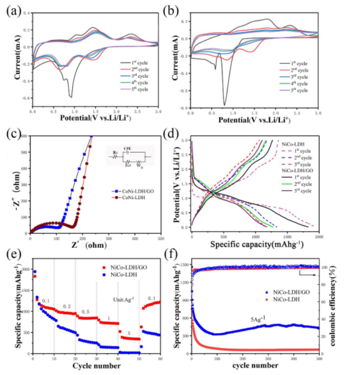 層狀雙金屬氫氧化物(LDH)陽極材料在高電流密度和長時間循環(huán)下,保持其出色的鋰離子存儲性質(zhì)仍然存在巨大挑戰(zhàn)。在這里,發(fā)展了一種雜化材料,將Ni/Co LDH(CoNi-LDH)錨定在氧化石墨烯(GO)表面上以獲得良好的結(jié)構(gòu)穩(wěn)定性。在生長過程中,層間距較低(4.6 Å)的β相轉(zhuǎn)換為層間距較高(8.1Å)的α相,且相對于單獨的CoNi-LDH片,引入GO后片更薄。XPS結(jié)果表明在超薄CoNi-LDH和GO之間形成了C=O化學鍵,提高了結(jié)構(gòu)穩(wěn)定性并有效降低電荷轉(zhuǎn)移阻抗。如預期的那樣,該雜化材料實現(xiàn)了長時間的循環(huán)穩(wěn)定性,在5 A/g高電流密度下可實現(xiàn)440 mAh/g的比電容,該研究工作表明引入GO后有效抑制了CoNi-LDH結(jié)構(gòu)的破壞。