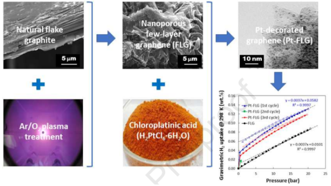 Figure1. 通過等離子體過程處理石墨獲得納米FLG材料,隨后熱還原氯鉑酸獲得Pt顆粒修飾的石墨烯納米復(fù)合材料,將其用于氫氣存儲。