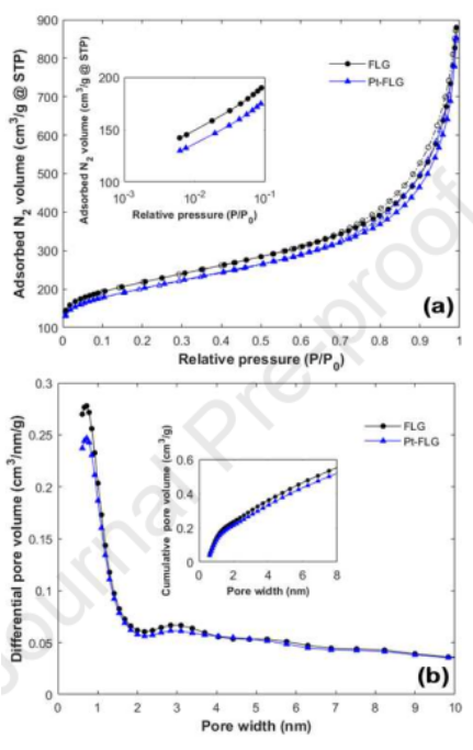 Figure 4. 純FLG和Pt修飾FLG粉末的(a)N2吸附/解吸等溫線,測試條件:77 K; 插圖顯示了更低壓力下對數(shù)范圍內(nèi)的N2吸附曲線和(b)基于QSDFT方法的不同孔徑尺寸分布情況。