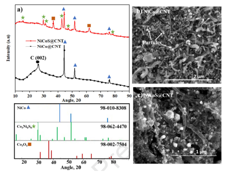 Figure 1. a) NiCo@CNT 和 NiCoS@CNT 的XRD圖,b) 兩個(gè)樣品的SEM圖。