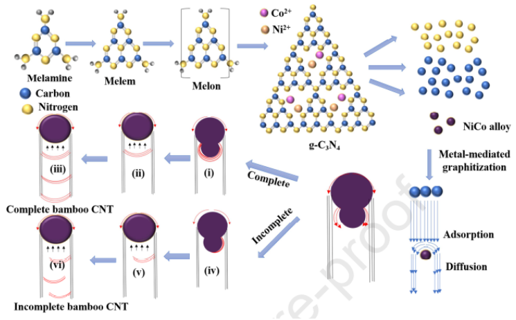 Figure 3. NiCo納米粒子存在下三聚氰胺聚合形成竹節(jié)狀CNT的過(guò)程示意圖。