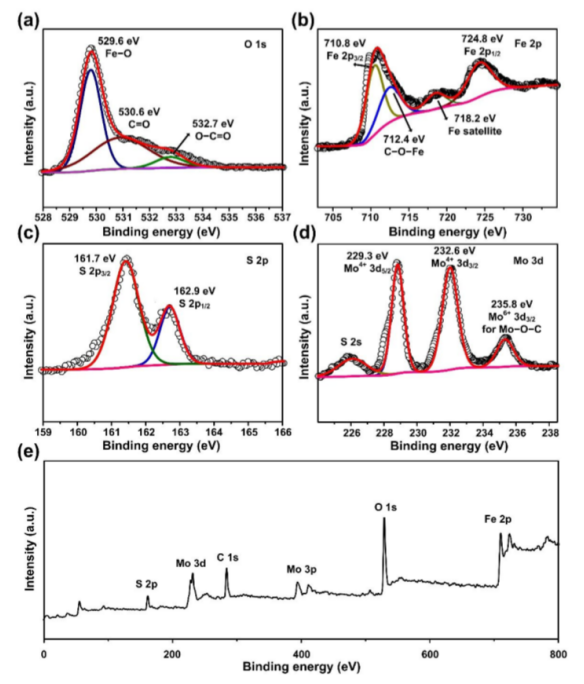 2/rGO的XPS:(a) O 1s,(b) Fe 2p,(c) S 2p,(d) Mo 3d,(e)全譜。