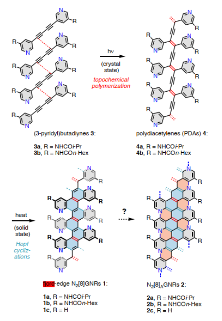 Figure 1.合成峽灣-邊緣的氮摻石墨烯納米帶的原理示意圖。