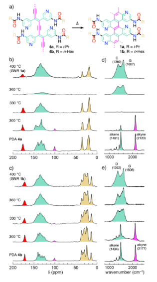 合成具有特定位點(diǎn)的雜原子取代的石墨烯納米帶(GNR)是一個(gè)基本目標(biāo),而研究者為了控制下一代有機(jī)材料的電子特性也必須實(shí)現(xiàn)這個(gè)目標(biāo)。 最近,該組研究者已經(jīng)報(bào)道了固態(tài)拓?fù)浠瘜W(xué)聚合/環(huán)化-芳構(gòu)化策略將簡(jiǎn)單的1,4-二(3-吡啶基)丁二炔轉(zhuǎn)變成海峽-邊緣氮摻石墨烯納米帶結(jié)構(gòu)。這里,通過CP/MAS
