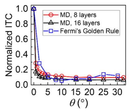 Figure 3. tBLG的界面熱傳遞速率和在各種失配角下所計算出的界面熱導(dǎo)率之間的費米黃金法則結(jié)果比較。