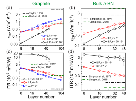 Figure 2.(a,b)整個堆疊層的橫截面熱導(dǎo)率與扭角的相關(guān)性,(c,d)石墨和塊體h-BN以最優(yōu)堆疊片形成扭曲接觸的界面熱阻與扭角的相關(guān)性。