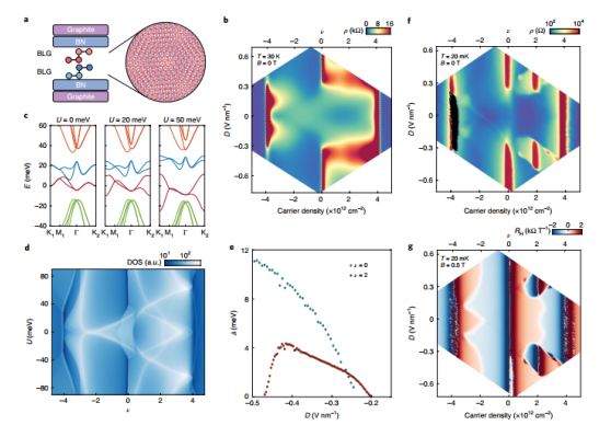 Figure 1. 1.30° tDBG裝置中可調(diào)的能帶結(jié)構(gòu)和傳輸特性。(a)tDBG裝置封裝在六邊形氮化硼(BN)和石墨柵極里的原理示意圖,(b)tDBG裝置的電阻率,(c)計(jì)算的能帶結(jié)構(gòu),(d)計(jì)算的態(tài)密度(DOS),(e)能帶隙,(f-g)電阻率和霍爾系數(shù)。