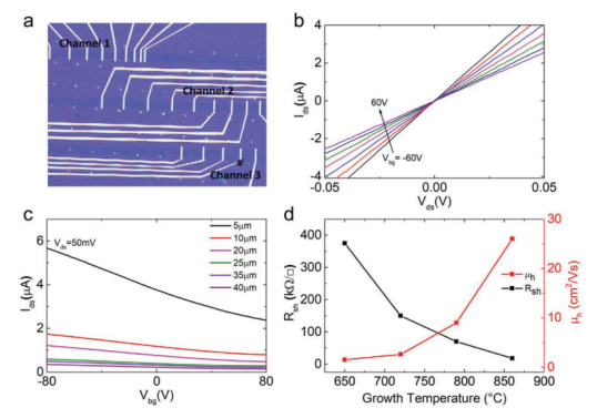 Figure 1. a)具有TLM幾何形狀的石墨烯FET的光學圖像。b)不同背柵電壓時的輸出曲線,c)相同裝置在不同通道長度時的轉移曲線。