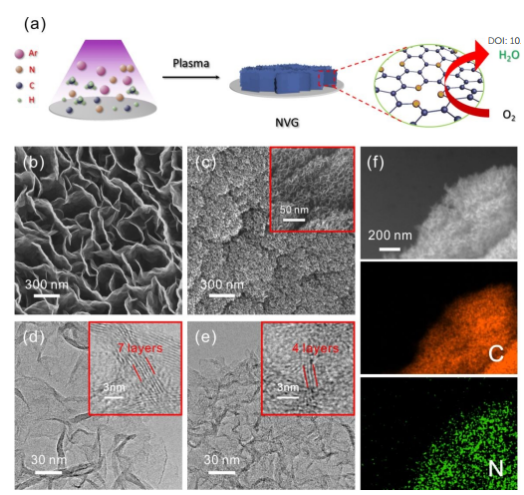 Figure 1. (a)使用H-PECVD系統(tǒng)制備N(xiāo)VG電催化劑的示意圖。 (b-c)VG和NVG-30的SEM圖像,(d-e)VG和NVG-30的TEM圖像。(f)NVG-30的SEM圖像和SEM-EDS元素圖,顯示了C和N元素的均勻分布。