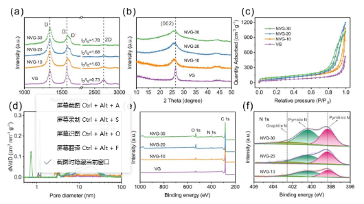 Figure 2.(a)拉曼光譜,(b)XRD圖,(c)N2吸附/解吸等溫線(xiàn),(d)孔徑分布,(e)VG,NVG-10,NVG-20和NVG-30的XPS光譜, 和(f)NVG-10,NVG-20和NVG-30的高分辨率XPS N 1s光譜。