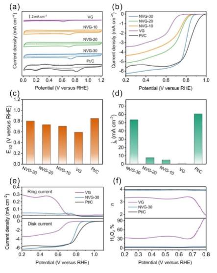 Figure 3. (a)在N2飽和(虛線(xiàn))和O2飽和(實(shí)線(xiàn))的0.1 M KOH溶液中的CV曲線(xiàn),掃描速率為50 mV s-1。(b)LSV曲線(xiàn)比較,轉(zhuǎn)速為1600 rpm,掃速為10mV s-1。(c)0.75 V時(shí)的半波電位和(d)動(dòng)力學(xué)電流密度。(e)環(huán)電流和盤(pán)電流。(f)H2O2產(chǎn)率和電子轉(zhuǎn)移數(shù)。