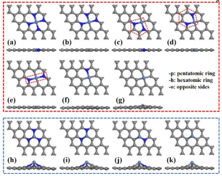 Figure 1.(a)NiN4,(b)NiN3C,(c)NiN2C2-p,(d)NiN2C2-h,(e)NiN2C2-o,(f)NiNC3,(g)NiC4,(h)NiN3,(i)NiN2C,(j)NiNC2,(k)NiC3的最優(yōu)幾何形狀。 灰色代表C原子,深藍(lán)色代表N原子,淺藍(lán)色代表Ni原子。