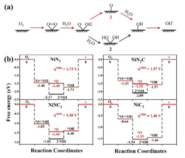 Figure 3. (a)三配位Ni-N-C-gra的可能ORR反應(yīng)路徑,(b)三配位Ni-N-C-gra在平衡電勢(shì)下用于ORR的自由能圖。