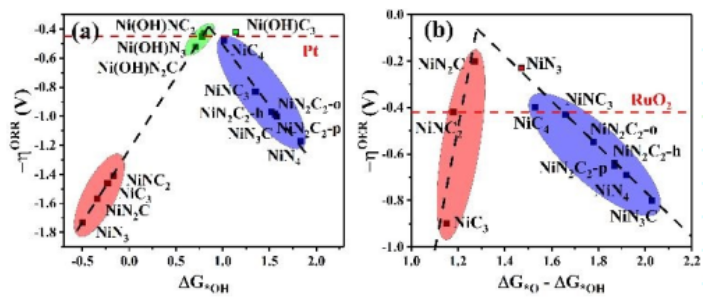 OER= 0.23、0.20和0.42 V)。分析OH配體效應(yīng)后,發(fā)現(xiàn)Ni(OH)N3,Ni(OH)NC2和Ni(OH)C3具有有效的ORR催化性能(η