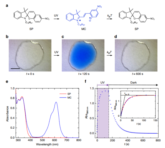 Figure 1. 光開關(guān)動力學(xué)的光學(xué)表征。(a)S)衍生物和MC異構(gòu)體的可逆的光化學(xué)和熱交換,(b-d)初始狀態(tài)以及光異構(gòu)化前后的光學(xué)照片,(e)SP/MC溶液的吸收光譜,(f)動力學(xué)檢測。