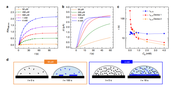 Figure 4. 光異構(gòu)化和自組裝動力學(xué)的濃度依賴性。(a-b)不同SP初始濃度時,吸光度和電流隨時間的演變,(c)時間常數(shù),(d)基于對測量數(shù)據(jù)的分析,以圖的形式呈現(xiàn)了出來。