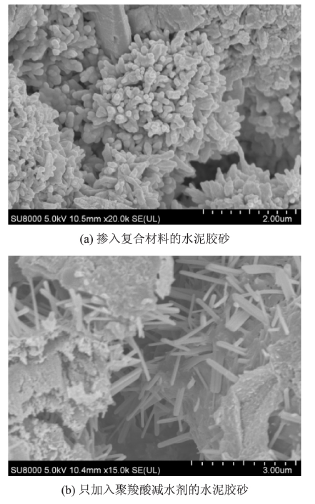 3)在電鏡下也對比了復(fù)合聚羧酸前后對膠砂表面形貌的影響,可以發(fā)現(xiàn),復(fù)合后團(tuán)聚生長的鈣礬石數(shù)量明顯增加,在很大程度上提高了GO 在膠砂中的分散程度,可見超塑劑對整體效果的影響還是很大的。