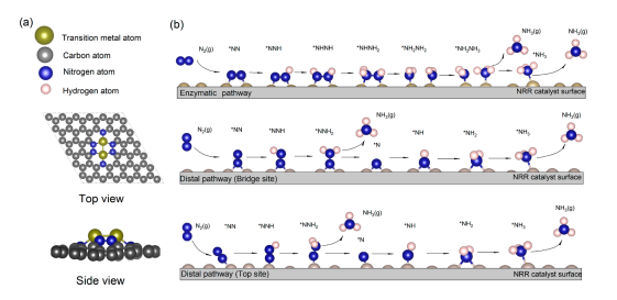 Figure 1. 原子對催化劑(APC)原子模型以及氮還原反應的酶促途徑和遠端途徑(橋位和頂位)。