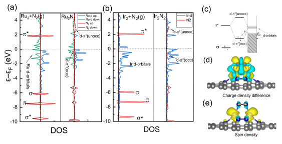 d軌道的相互作用圖。(d)電荷密度差和(e)吸附在Ru