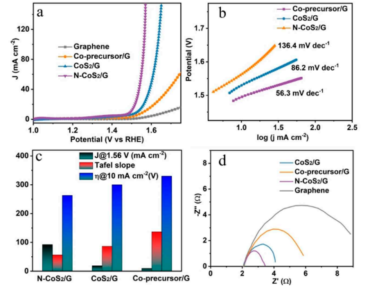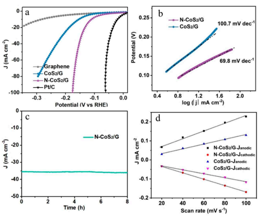 2/G催化劑的水電解線性極化曲線。(c)N CoS