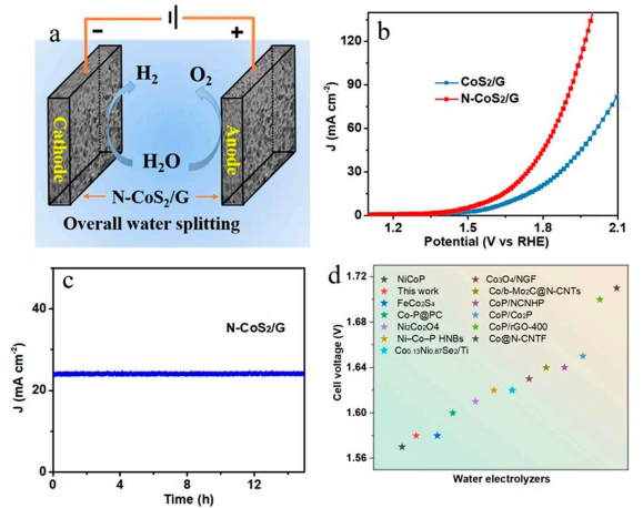 2/G表現(xiàn)出優(yōu)異的催化活性,對(duì)于OER為260 mV,對(duì)于HER為109 mV的低過(guò)電勢(shì)。組裝好的N CoS