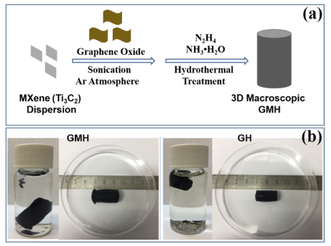 2)納米片的自組裝,制備了圓柱型3D宏觀石墨烯/MXene基水凝膠(GMH)。發(fā)現(xiàn)GO在水熱過程中會自動收斂到3D宏觀多孔石墨烯骨架中,而Ti