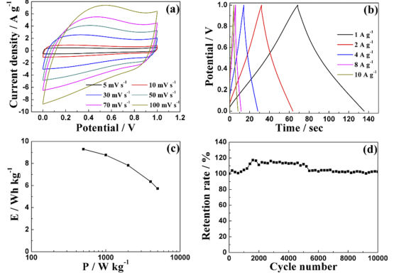 Figure 3. (a)GMH基SC在不同掃描速率下的CV曲線;(b)GMH基SC在各種電流密度下的GCD曲線;(c)GMH基SC的Ragone圖;(d)GMH基SC在4 A g