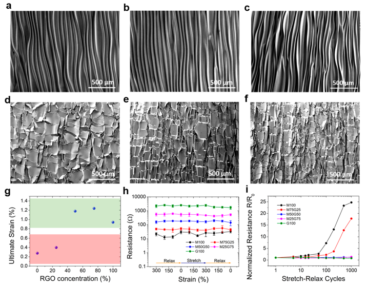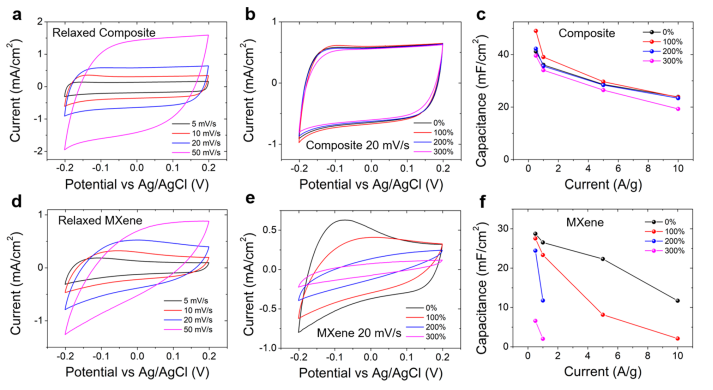 x/RGO復(fù)合電極減輕了在大應(yīng)變下產(chǎn)生的裂紋。復(fù)合電極在承受單軸(300%)或雙軸(200%×200%)循環(huán)應(yīng)變時(shí)表現(xiàn)出49 mF/cm
